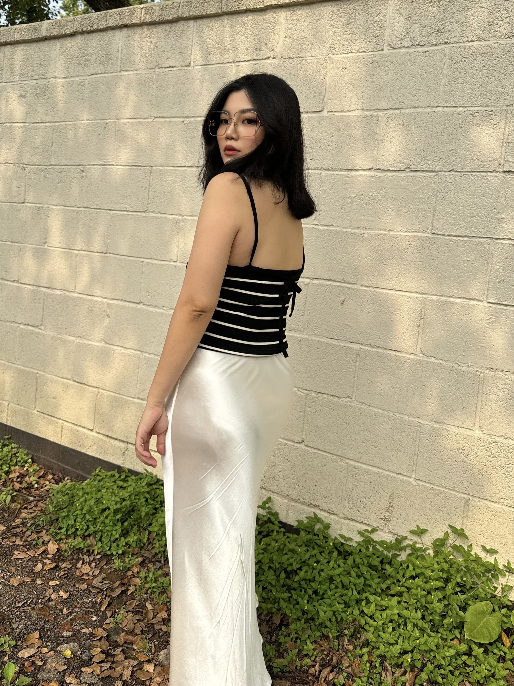 兩穿式可調節條紋細肩帶上衣 黑底米白條紋